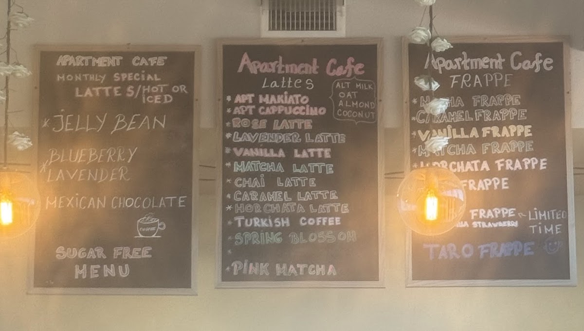 The menu at Apartment Cafe offers a variety of coffee and specialty beverages alongside light food options. Visitors will find a diverse selection of drinks including espresso-based beverages, lattes, frappes, and traditional coffee styles.